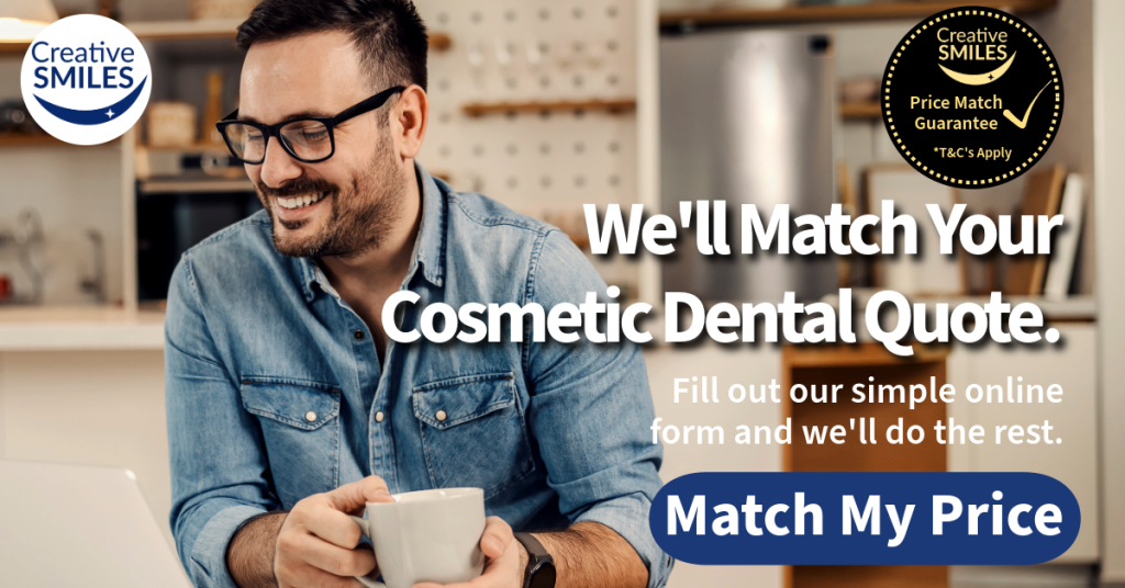We’re thrilled to offer you our price match guarantee, designed to ensure that you not only achieve the confident and radiant smile you’ve always desired but also do so at the most competitive prices in the market. At Creative Smiles, we understand the importance of affordability without compromising quality. Our Price Match Guarantee reflects our commitment to providing you with top-notch dental solutions while matching the best prices you can find. Simply fill out the form below, and let our experienced team take care of the rest. Your journey towards a stunning smile begins here, backed by our assurance of unbeatable prices and exceptional dental care.